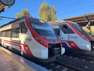 Dos trenes de Cercanías de Renfe se cruzan en la parada apeadero de Los Álamos en Torremolinos. - EUROPA PRESS