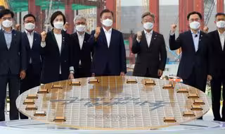 13 May 2021, South Korea, Pyeongtaek: South Korean President Moon Jae-in (4th R) and other participants pose for a picture during a presentation on the K-semiconductor Strategy at a Samsung Electronics Co. semiconductor complex, where a groundbreaking c - -/YNA/dpa