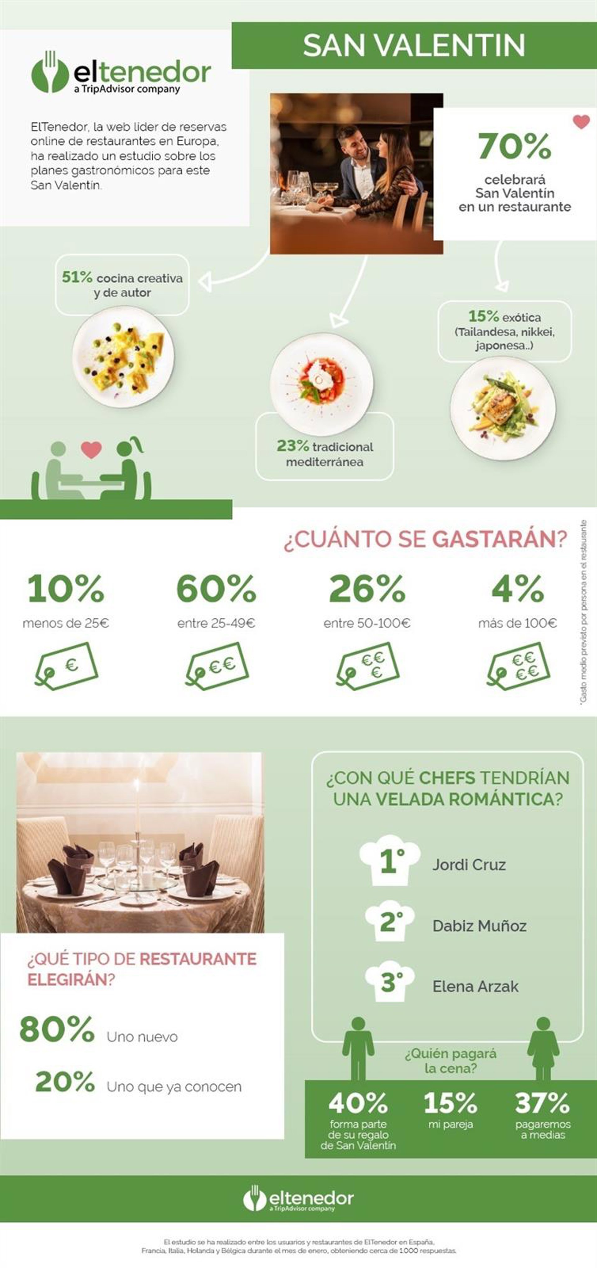 El 70% de los españoles reconoce que celebrará San Valentín en un restaurante y elevará su gasto medio hasta los 50 euros, según un estudio realizado por ElTenedor.