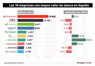 En concreto, las marcas españolas resisten al coronavirus y se mantienen en la lista de las 500 más valiosas del mundo, pero el impacto de la pandemia se ha notado en estas compañías, ya que el valor de marca de las siete en 2020 sumaba 59.300 millones de euros, mientras que este año se reduce a 50.250 millones, lo que supone un 15% menos que el año pasado.