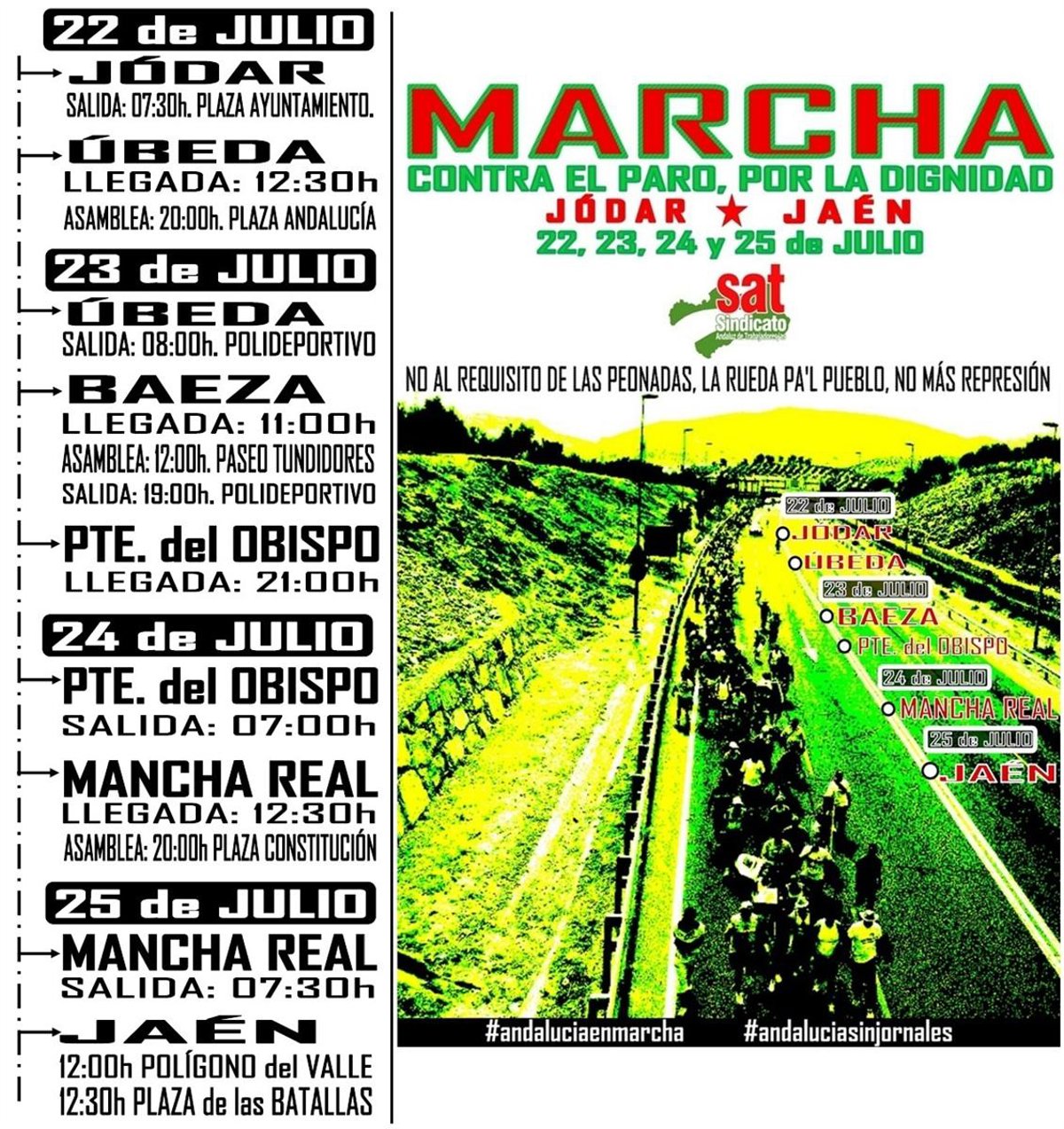 La sección provincial del Sindicato Andaluz de Trabajadores (SAT) inicia este lunes en el municipio jiennense de Jódar una marcha a pie de cuatro etapas que llevará a sus participantes a la ciudad de Jaén el próximo jueves día 25 "contra el paro y la represión", a favor de la supresión del requisito de las peonadas para cobrar el subsidio agrario y "por la puesta en marcha del Patrimonio Agrario Andaluz como herramienta de creación de empleo" en las comarcas de la provincia.