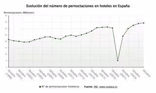 Las pernoctaciones en establecimientos hoteleros españoles superaron los 34,2 millones el pasado mes de octubre, lo que representa un aumento del 1,3% respecto al mismo mes de 2024, según datos publicados este viernes. Además, el sector mejoró su rentabilidad, con los hoteles facturando 120,5 euros de media por habitación ocupada (ADR), un 3,9% más que el año anterior.