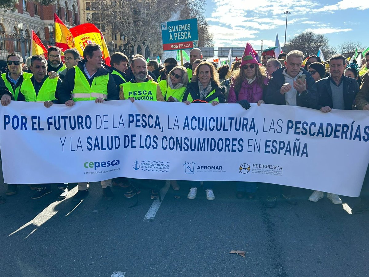 El sector pesquero español, representado este lunes en Madrid por la Asociación Empresarial de Acuicultura Española (Apromar), Confederación Española de Pesca (Cepesca), Federación Nacional de Asociaciones Provinciales de Empresarios Detallistas de Pescados y Productos Congelados (Fedepesca) y Federación Nacional de Cofradías de Pescadores (FNCP), se han unido a la manifestación agraria al compartir los mismos problemas como el exceso de regulación y competencia desleal frente a países terceros, al tiempo que han vuelto a reclamar la bajada del IVA a los productos pesqueros tras la caída drástica de su consumo.