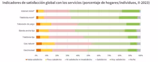 Otros servicios que se incluyen en el Panel de Hogares son los de banda ancha fija, con los que el 59,1% de la población está satisfecha o muy satisfecha (-0,79 puntos frente al Panel de Hogares anterior), el de telefonía fija (51,33%, que supone 1,12 puntos menos) y el de televisión de pago, que consigue un 59,63% (-0,98 puntos).