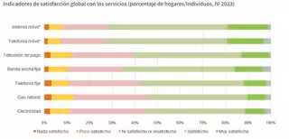 Otros servicios que se incluyen en el Panel de Hogares son los de banda ancha fija, con los que el 62,1% de la población está satisfecha o muy satisfecha (tres puntos más frente al estudio anterior); el de telefonía fija (55,2%, que supone 3,9 puntos menos) y el de televisión de pago, que consigue un 60,7% (-1,1 puntos).