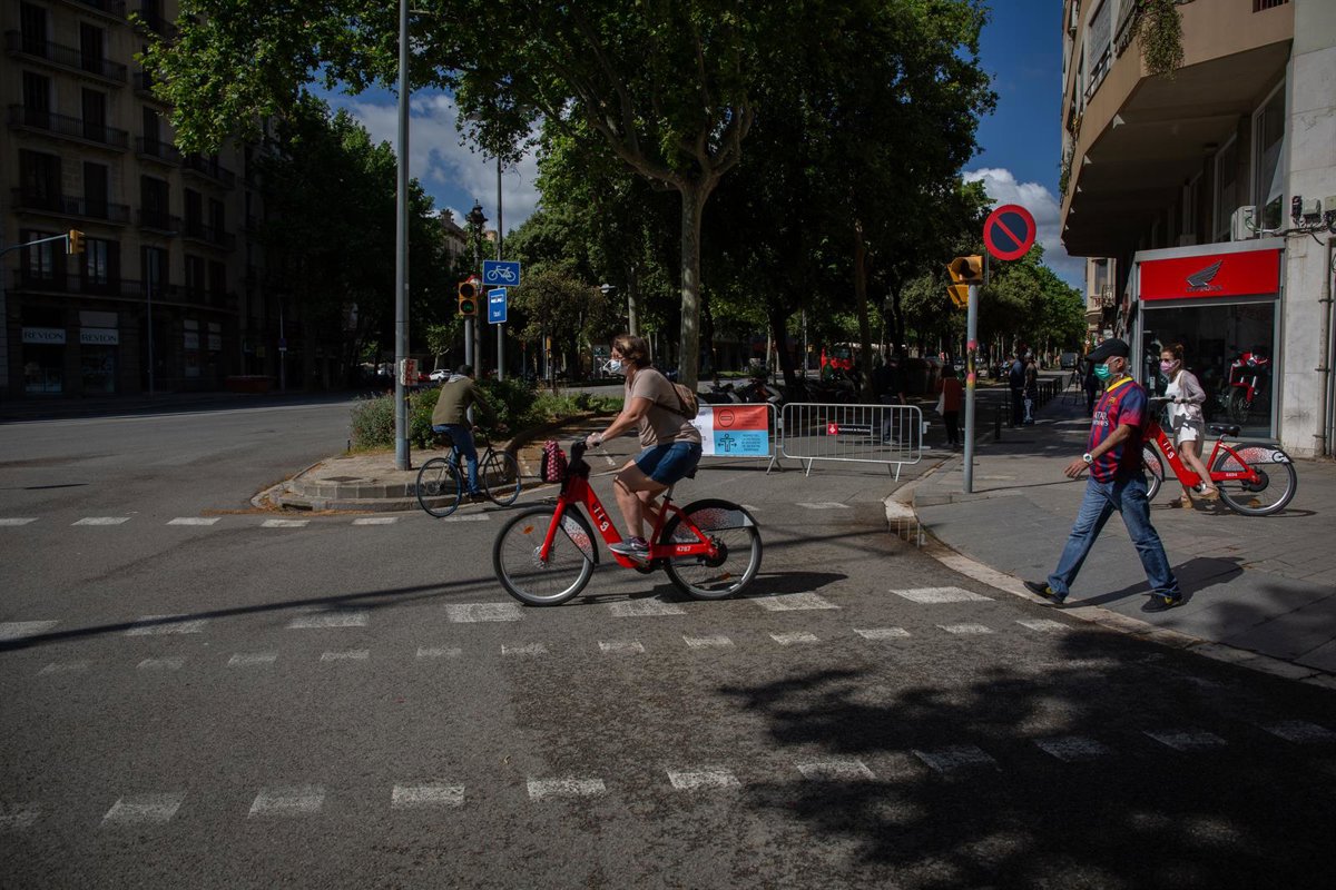 Transeúentes pasan al lado de las vallas instaladas para cortar el tráfico lateral de la Diagonal (Diagonal-Sant En Barcelona, Catalunya (España), a 13 de mayo de 2020. - David Zorrakino - Europa Press