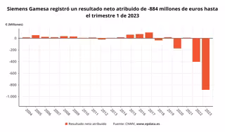 Siemens Gamesa registró pérdidas netas de 884 millones de euros en su primer trimestre fiscal (octubre-diciembre de 2022), duplicando así el resultado negativo de 403 millones de euros que obtuvo en el mismo periodo del año anterior, según ha informado este jueves la compañía, que ha precisado que su desempeño financiero en este primer trimestre se vio afectado por el resultado de la evaluación de su flota instalada.