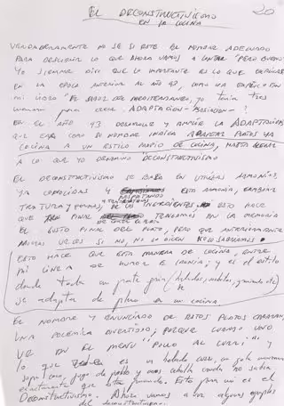 En el manuscrit, que és un objecte únic perquè la resta de llibres els va escriure a ordinador, Adrià reflexiona sobre alguns dels seus plats més cèlebres, així com materials, tècniques de cocció, varietats d'espumes i el món del fred, entre d'altres coses, ha informat la casa de subhastes La Suite en un comunicat.