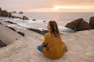 Mujer joven sentada junto al mar - MARIOGUTI