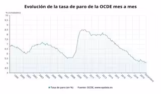 La tasa de paro de la Organización para la Cooperación y el Desarrollo Económicos (OCDE) descendió el pasado mes de diciembre hasta el 5,059%, lo que representa un ligero descenso con respecto al 5,119% del mes anterior y la mejor lectura del dato desde que existen registros, según informó este martes la institución con sede en París.