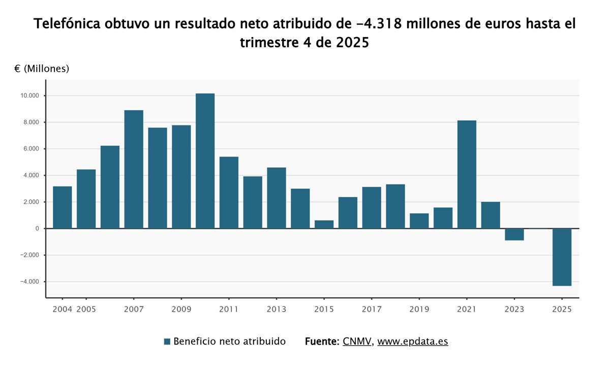 Telefónica registró unas pérdidas netas atribuidas de 4.318 millones de euros en 2025 derivadas de factores no recurrentes en las operaciones continuadas, como los costes de reestructuración o el deterioro de determinados activos, y por el impacto de las desinversiones en Latinoamérica.