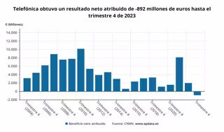 Telefónica registró unas pérdidas contables de 892 millones de euros en 2023 tras la provisión del plan de reestructuración de Telefónica España y el deterioro del fondo de comercio en su filial de Reino Unido, si bien sus ingresos crecieron un 1,6%, hasta los 40.652 millones de euros, según ha informado la operadora, que ha cumplido todos sus objetivos financieros para 2023 y ha confirmado un dividendo en efectivo de 0,3 euros para este año.