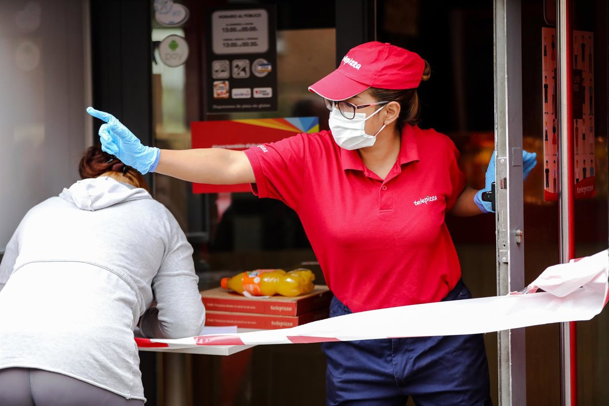 Una mujer recoge un menú infantil de Telepizza en el barrio de Abrantes, cadena que, junto a Rodilla, reparte un menú escolar a más de 11.500 alumnos beneficiarios de beca comedor en la Comunidad de Madrid, en Madrid (España) a 20 de marzo de 2020. - Jesús Hellín - Europa Press
