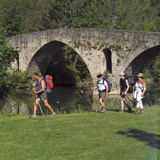 Archivo - Peregrinos del Camino de Santiago junto al puente de la Magdalena. - GOBIERNO DE NAVARRA - Archivo