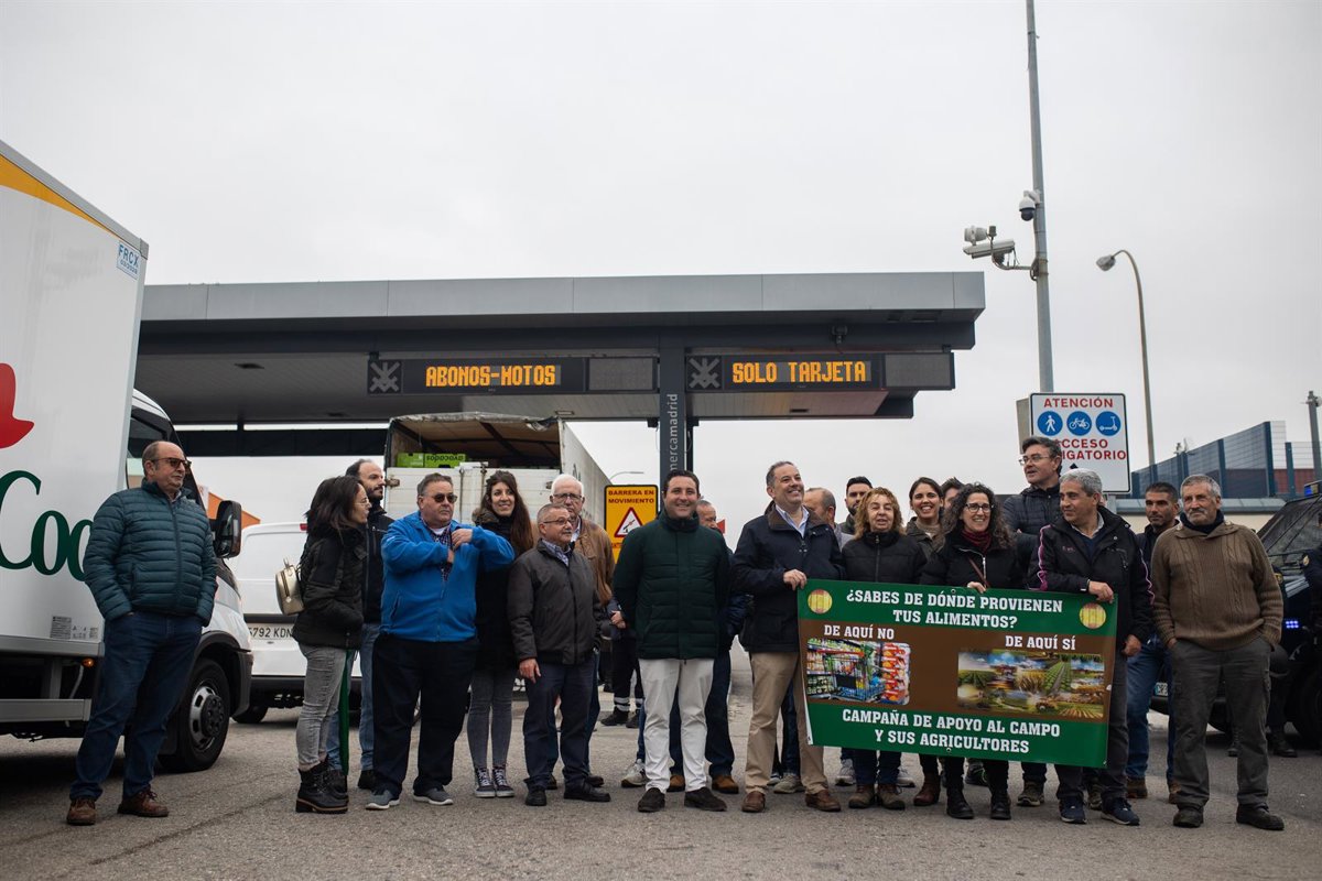 Varios agricultores con una pancarta se concentran en uno de los accesos a Mercamadrid, a 14 de febrero de 2024, en Madrid (España). - Alejandro Martínez Vélez - Europa Press