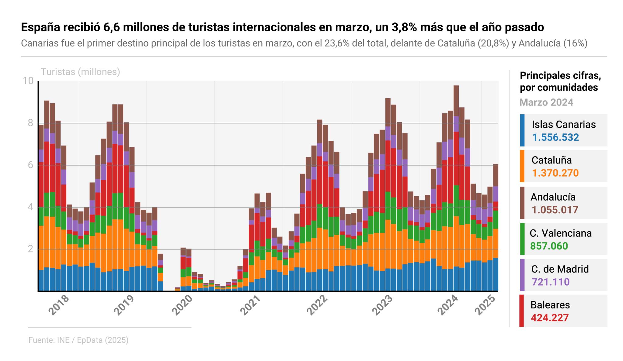 A Canarias llegaron un 0,9% más de turistas que en marzo de 2024. El número de turistas que visitaron Cataluña aumentó un 1,0% y a Andalucía vinieron un 10,2% más.