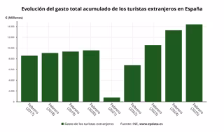 Concretamente, en el mes de marzo llegaron a España 6,6 millones de turistas foráneos, que realizaron un gasto superior a los 9.100 millones de euros. En tasa interanual crecen tanto el gasto (+5,6%) como las llegadas (+3,8).