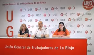 Junto a Lázaro, han comparecido el secretario general de UGT La Rioja, Juan José Bárcenas - que ha comenzado su intervención, dejando claro que 'Unipapel' "no cierra", sino que hay un Expediente de Regulación Temporal de Empleo (ERTE), que en la comunidad riojana afecta a 65 empleados - y la secretaria de FeSMC-UGT La Rioja, Ana Cruz Llach.