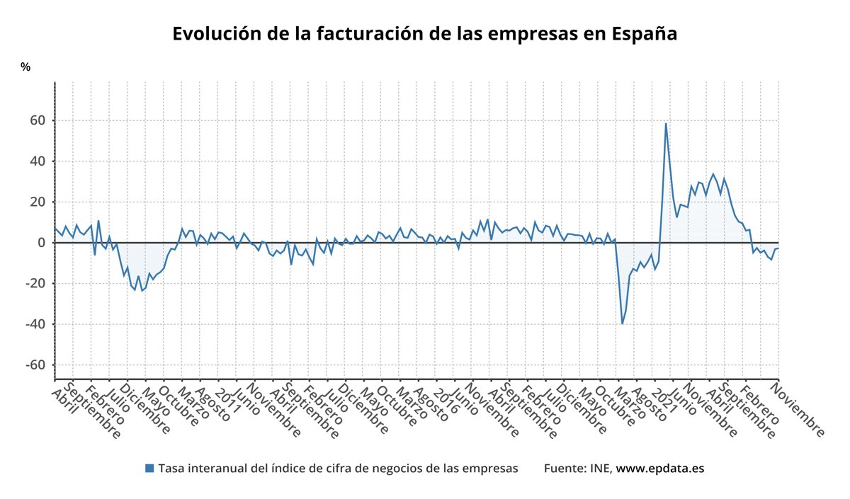La cifra de negocios de las empresas bajó un 2,7% el pasado mes de noviembre respecto al mismo mes de 2022, moderando en cuatro décimas el retroceso interanual experimentado el mes anterior, según el Índice de Cifra de Negocios Empresarial (ICNE) publicado este lunes por el Instituto Nacional de Estadística (INE).