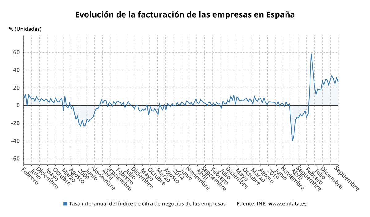 La cifra de negocios de las empresas aumentó un 26,5% en septiembre respecto al mismo mes de 2021, moderando en casi cinco puntos la subida registrada el mes anterior, según el Índice de Cifra de Negocios Empresarial (ICNE) publicado este viernes por el Instituto Nacional de Estadística (INE).