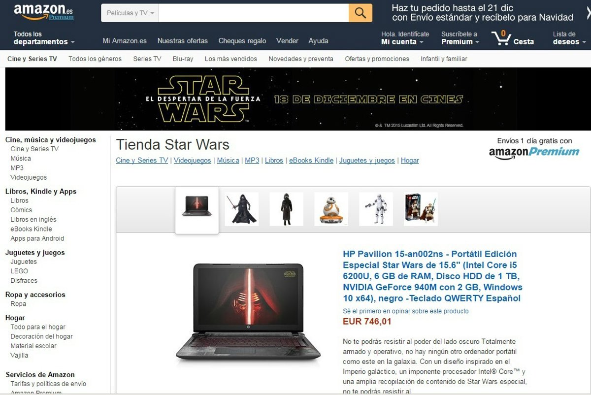 Las ventas de productos de 'El despertar de la fuerza', la séptima entrega de la saga Star Wars, se han disparado un 300% en Amazon.es en la última semana antes de su estreno en los cines españoles, según datos de la compañía a los que ha tenido acceso Europa Press.