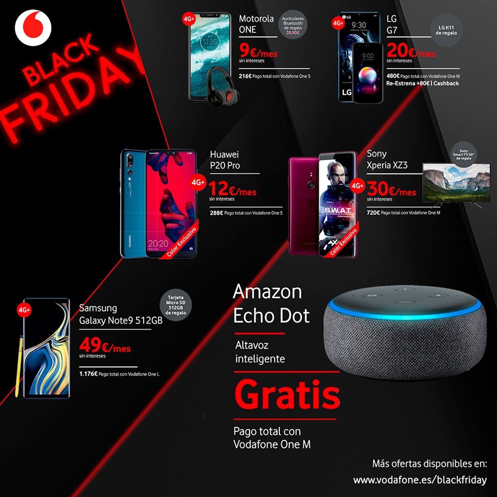 Además, la operadora también ofrece este Black Friday smartphones con descuentos de hasta el 60%, como el Huawei P20 Pro, o con regalos como Smart TV, otro smartphone, auriculares o wearables, promociones vinculadas al pago a plazos sin intereses durante 24 meses ligados a tarifa (con portabilidad y permanencia).