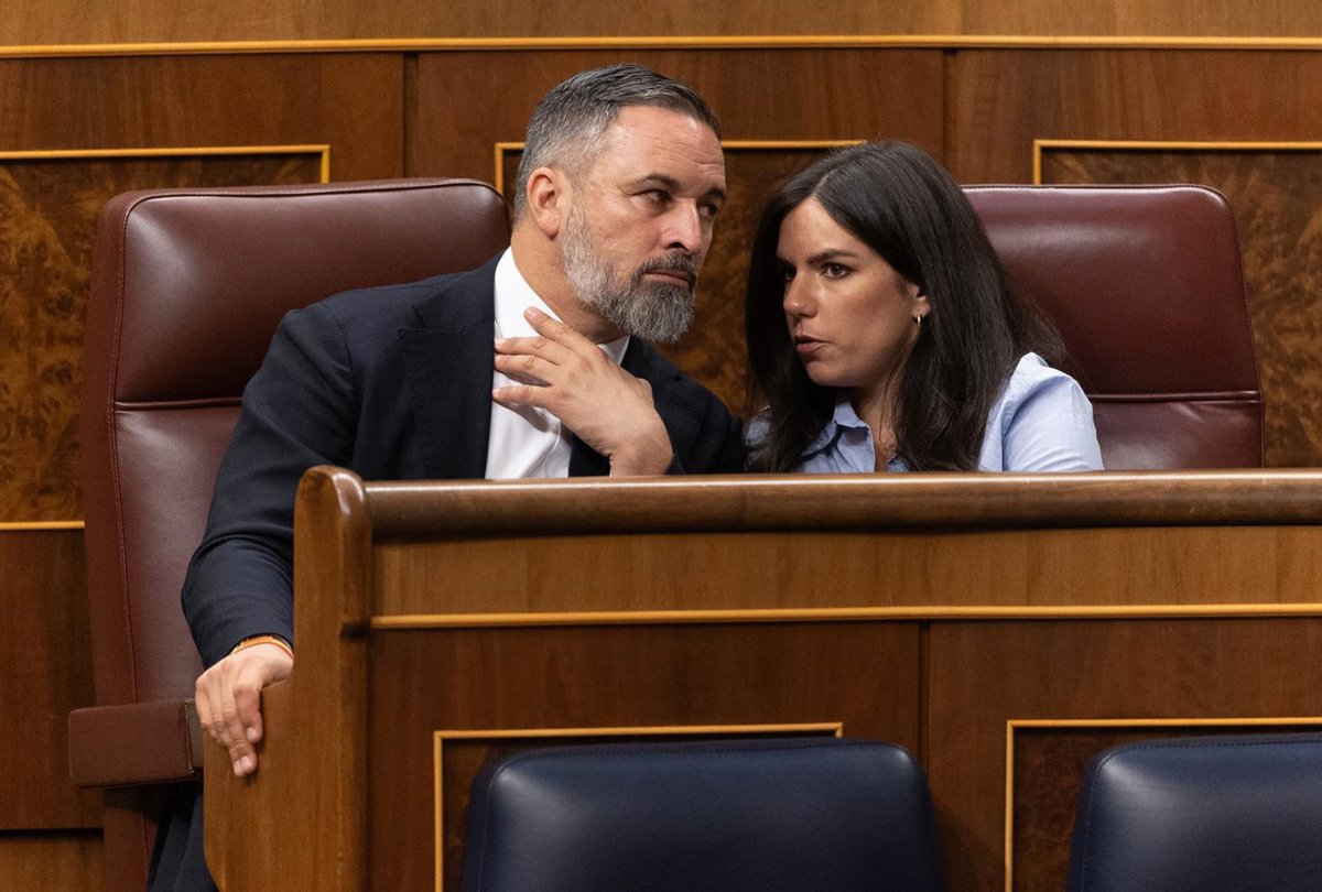 El líder de Vox, Santiago Abascal, y la portavoz de Vox en el Congreso, Pepa Millán, durante una sesión plenaria extraordinaria, en el Congreso de los Diputados, a 22 de julio de 2025, en Madrid (España). - Eduardo Parra - Europa Press