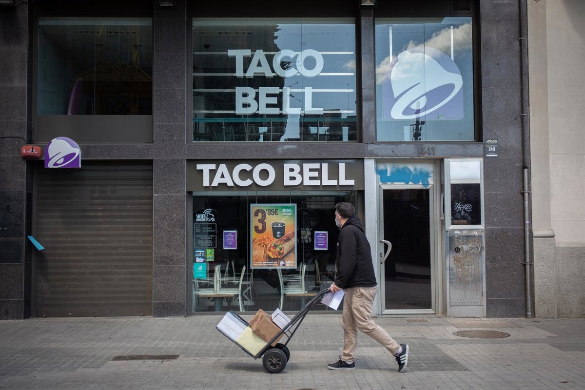 Archivo - Un repartidor pasa por delante de un establecimiento de la cadena de restaurantes Taco Bell durante el día 45 del estado de alarma decretado por el Gobierno por la pandemia del Covid-19, en Barcelona/Catalunya (España) a 28 de abril de 2020. - David Zorrakino - Europa Press - Archivo