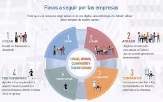 Manpowergroup propone cuatro puntos clave para solucionar el problema de la escasez de talento y acelerar así el crecimiento económico: crear (invertir en formación y desarrollo), atraer (atraer el talento que no puede generarse internamente), compartir (permanecer atentos a las comunidades de talento externas) y transformar (ayudar a los profesionales a promocionarse dentro o fuera de la empresa).