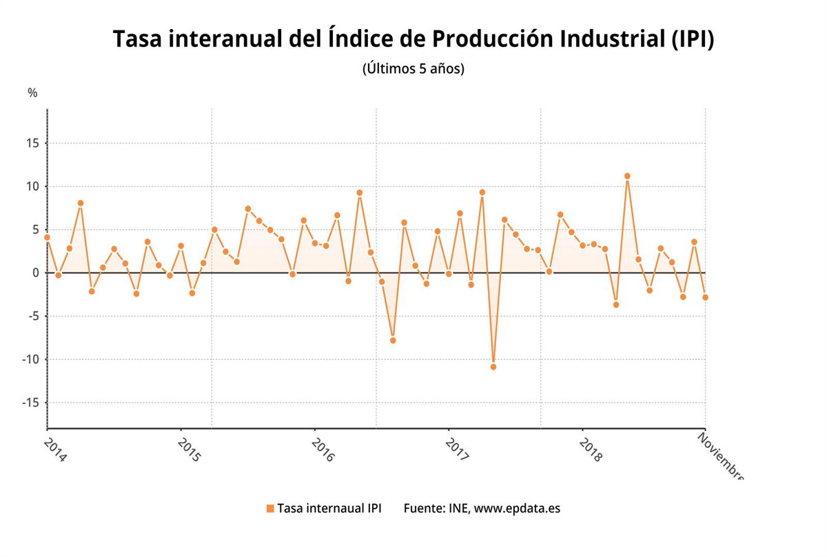 El Índice General de Producción Industrial (IPI) bajó un 2,8% el pasado mes de noviembre en relación al mismo mes de 2017, tasa 6,5 puntos inferior a la de octubre, según ha informado este viernes el Instituto Nacional de Estadística (INE).