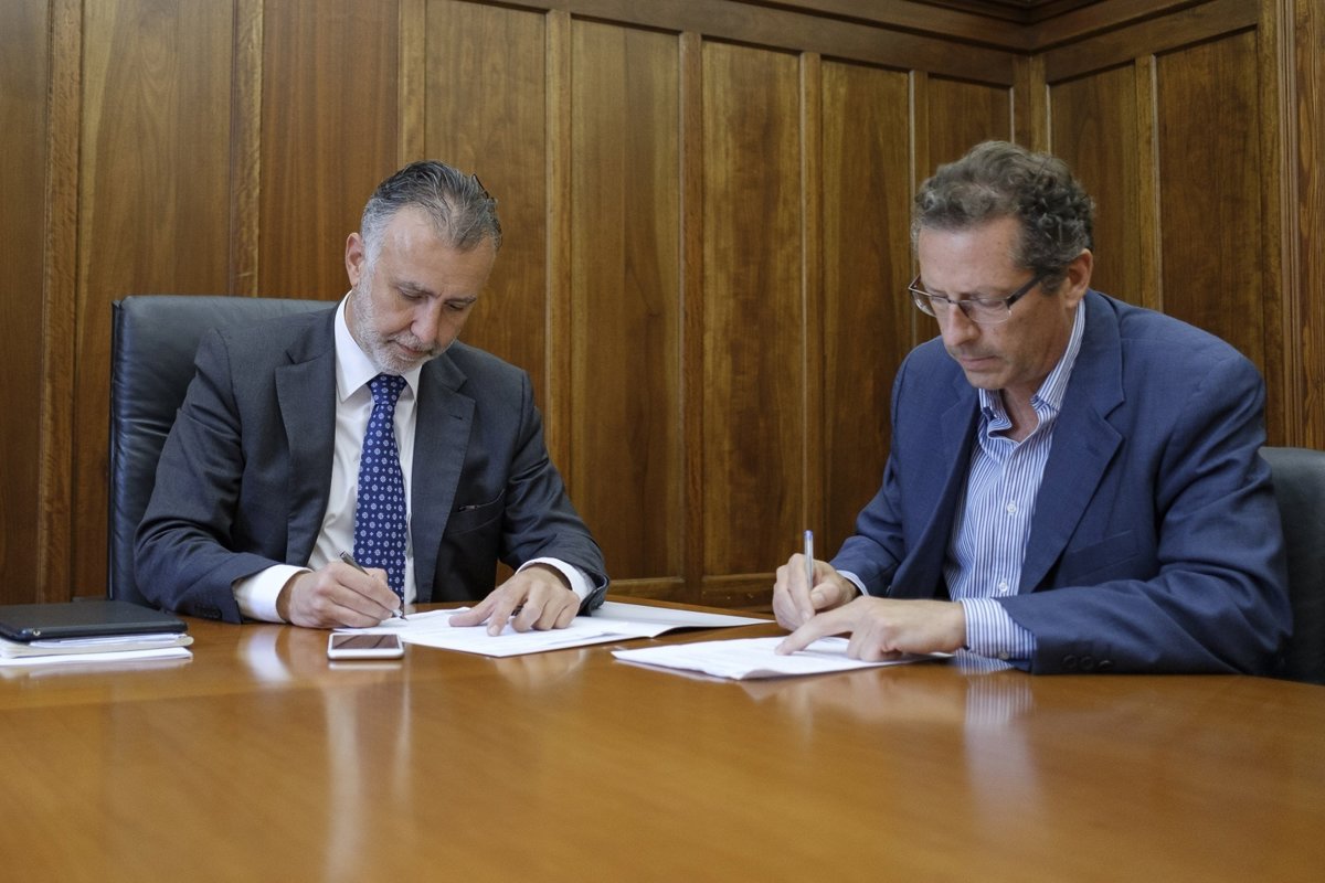 El consejero ha firmado la adjudicación del servicio por la vía de emergencia a la empresa Ayagaures junto a su gerente, Antonio Rodríguez, hasta la adjudicación del nuevo contrato, que está en mesa de contratación, en los próximos meses.