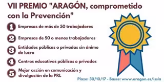 El Consejo Aragonés de Seguridad y Salud Laboral, del que forman parte la Dirección General de Trabajo del Gobierno de Aragón, el Instituto Aragonés de Seguridad y Salud Laboral (ISSLA) y los agentes sociales, ha convocado el concurso para otorgar el VII Premio 'Aragón, comprometido con la Prevención'.