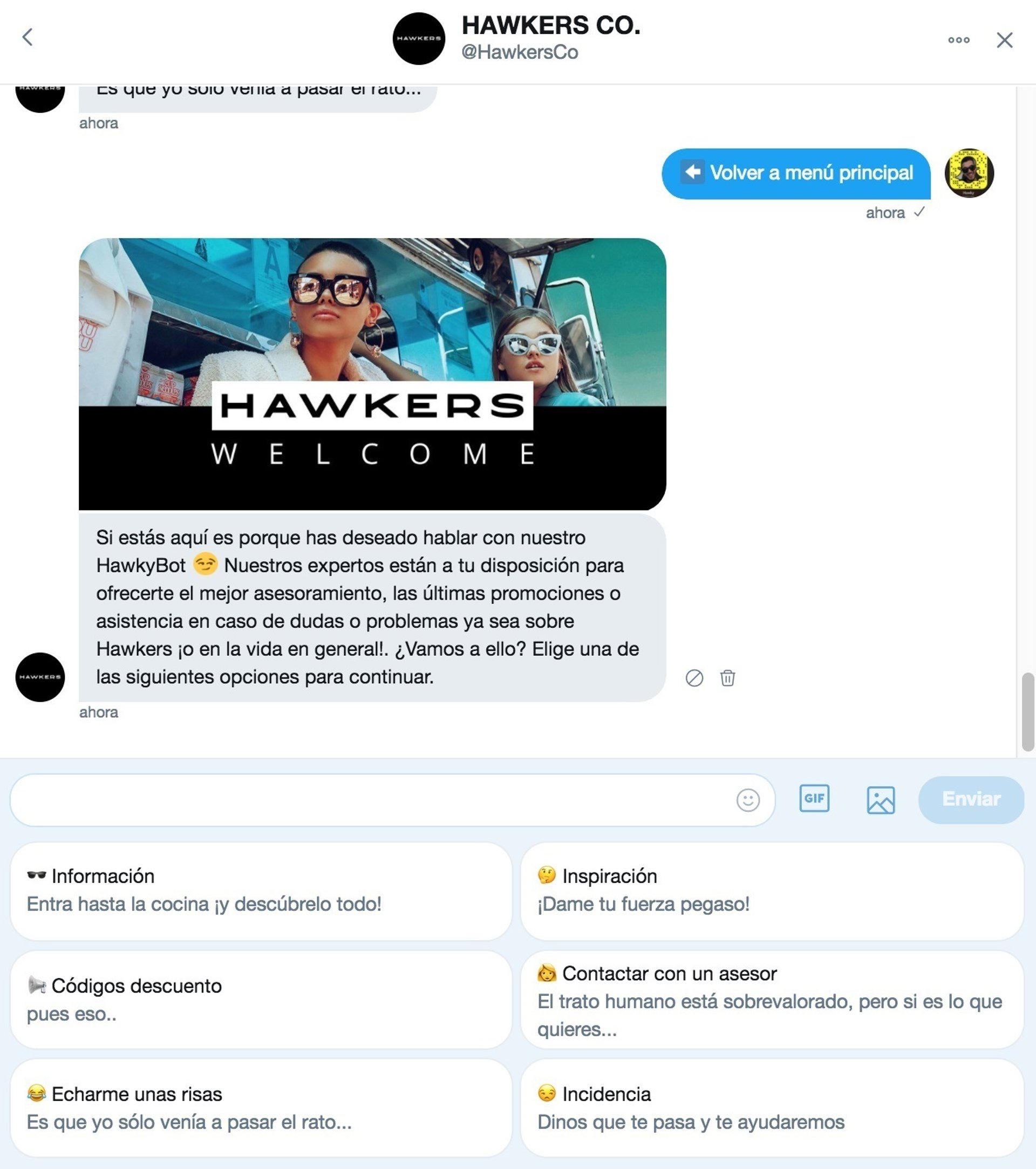De esta forma, el usuario solo tiene que enviar un mensaje directo a @HawkersCo y a partir de ahí, el sistema de 'bots' de autorrespuesta le propone diferentes opciones mediante las cuales podrá interactuar en tiempo real con la marca, de forma ágil y sencilla: ver el catálogo, escoger colores, conocer precios y, si finalmente lo decide, comprar el producto. El 'bot' asesorará al cliente paso a paso para encontrar la gafa que mejor se adapta a su estilo de vida e intereses.