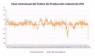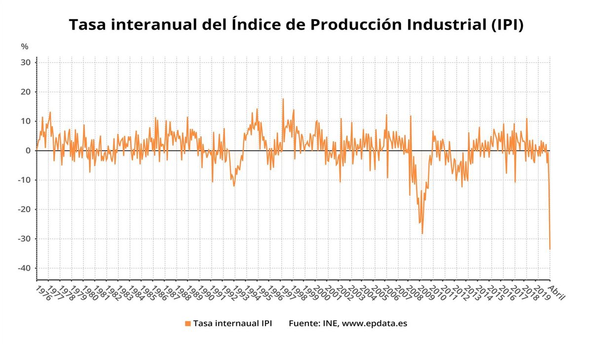 El Índice General de Producción Industrial (IPI) se desplomó un 33,6% el pasado mes de abril en relación al mismo mes de 2019, su mayor descenso interanual desde el inicio de la serie, en 1976, como consecuencia de la crisis sanitaria y la paralización casi total del sector industrial durante la primera quincena de abril, cuando se puso en marcha el permiso retribuido recuperable para trabajadores no esenciales, según ha informado este viernes el Instituto Nacional de Estadística (INE).