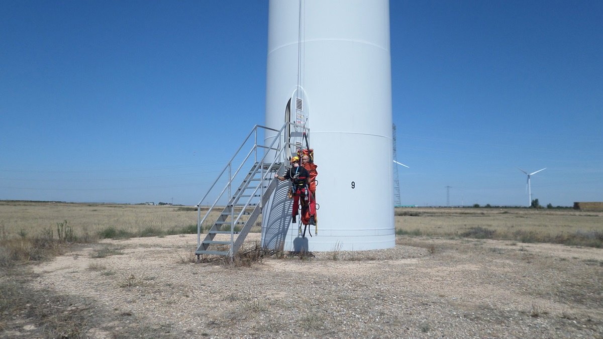 Además de contar con la participación del personal responsable del parque y de la empresa fabricante de los aerogeneradores, en el desarrollo de la prueba han colaborado tres efectivos del grupo de Rescates Verticales del Cuerpo de Bomberos de Zaragoza.