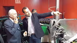 El consejero de Economía y Empleo del Gobierno de Aragón, Francisco Bono, y el alcalde de Calatayud, José Manuel Aranda, han visitado este jueves las bodegas y han conocido el proceso productivo del cava en Bodegas Langa.