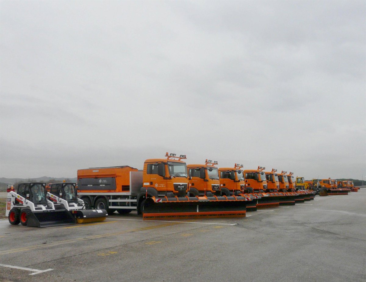 Entre ellos destacan, 22 vehículos medidores de coeficiente de rozamiento, 21 camiones con cuchilla quitanieves con esparcidor de fundente, tres camiones esparcidores de fundente líquido y 17 barredoras (con cuchilla quitanieves o sopladoras), así como camiones contraincendios, tractores y vehículos 4x4 equipados con cuchillas quitanieves.
