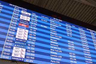 09 April 2025, Greece, Athens: The main board at Athens' empty Eleftherios Venizelos Airport shows flights canceled during a 24-hour strike. - Socrates Baltagiannis/dpa