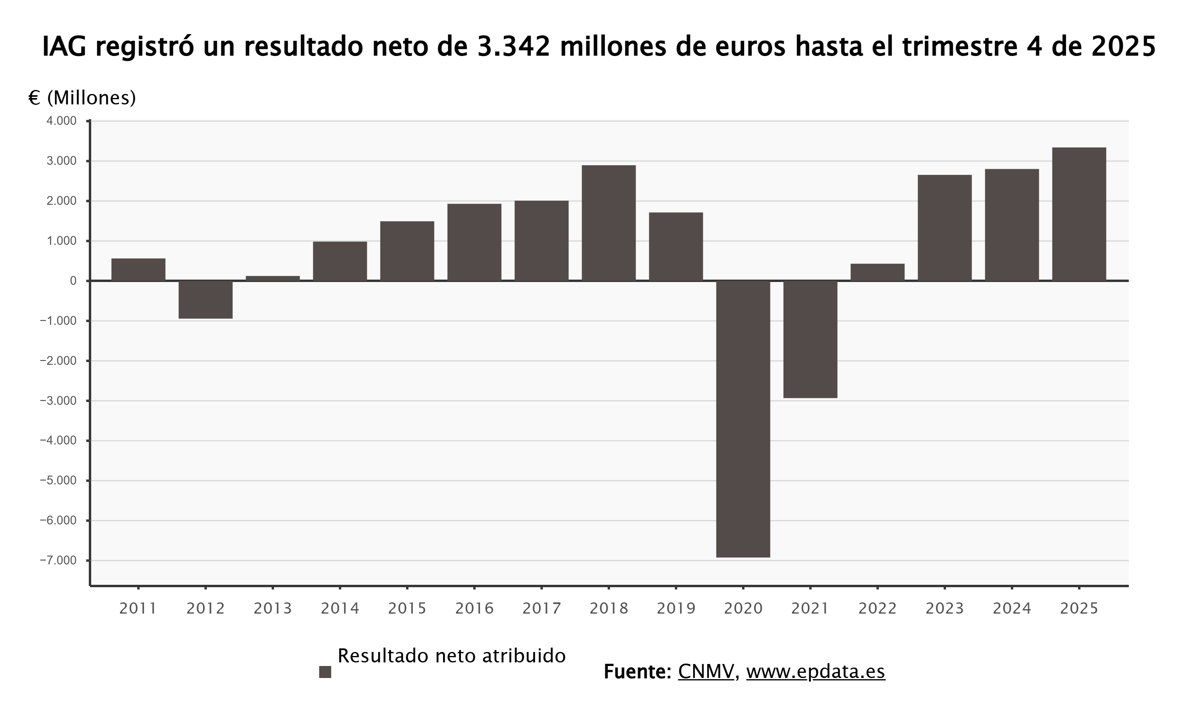 IAG registró un beneficio después de impuestos de 3.342 millones de euros, un 22,3% más que un año antes, lo que supone una cifra récord para la compañía según ha notificado este viernes a la Comisión Nacional del Mercado de Valores (CNMV).