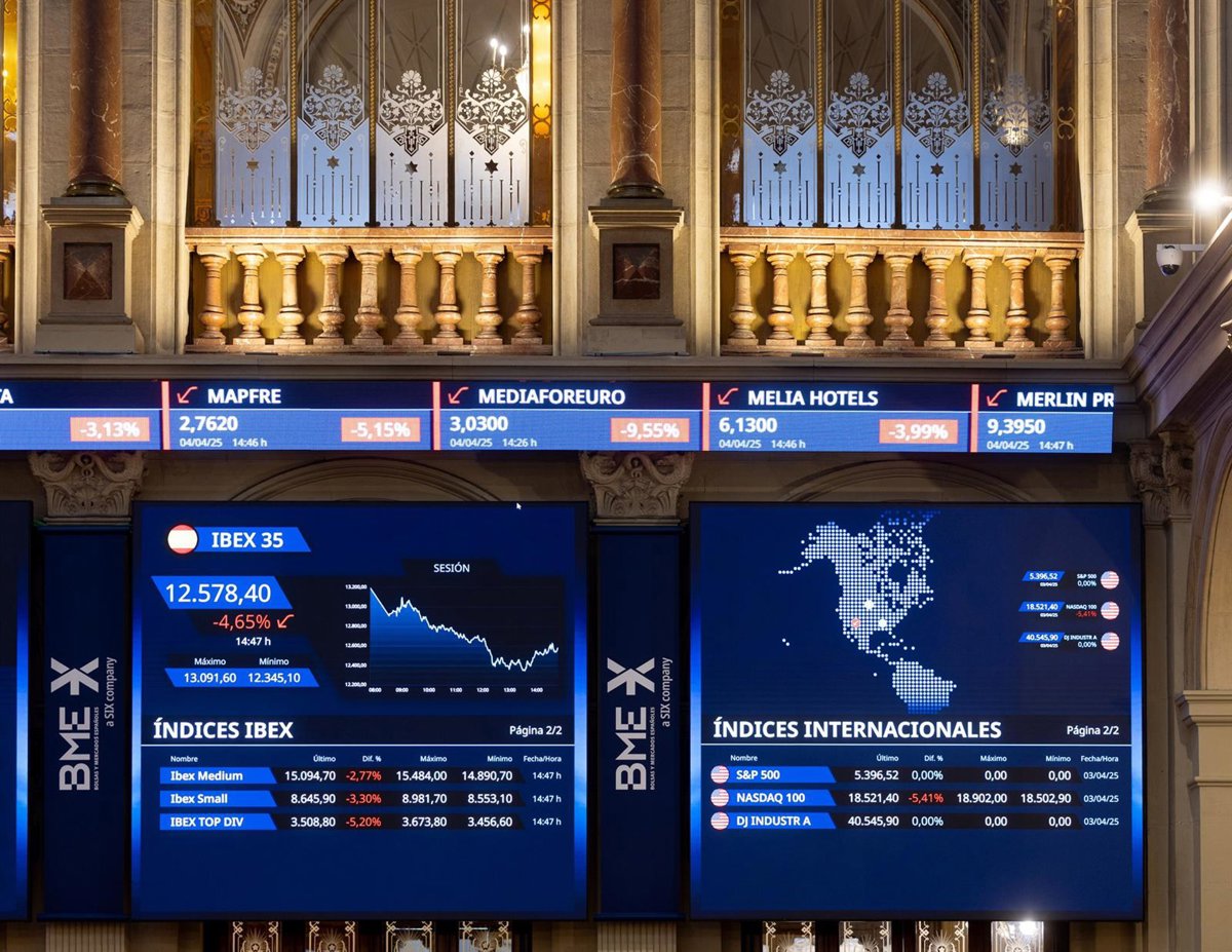 Archivo - Dos paneles del IBEX 35 en el Palacio de la Bolsa de Madrid, a 4 de abril de 2025, en Madrid (España). - Eduardo Parra - Europa Press - Archivo