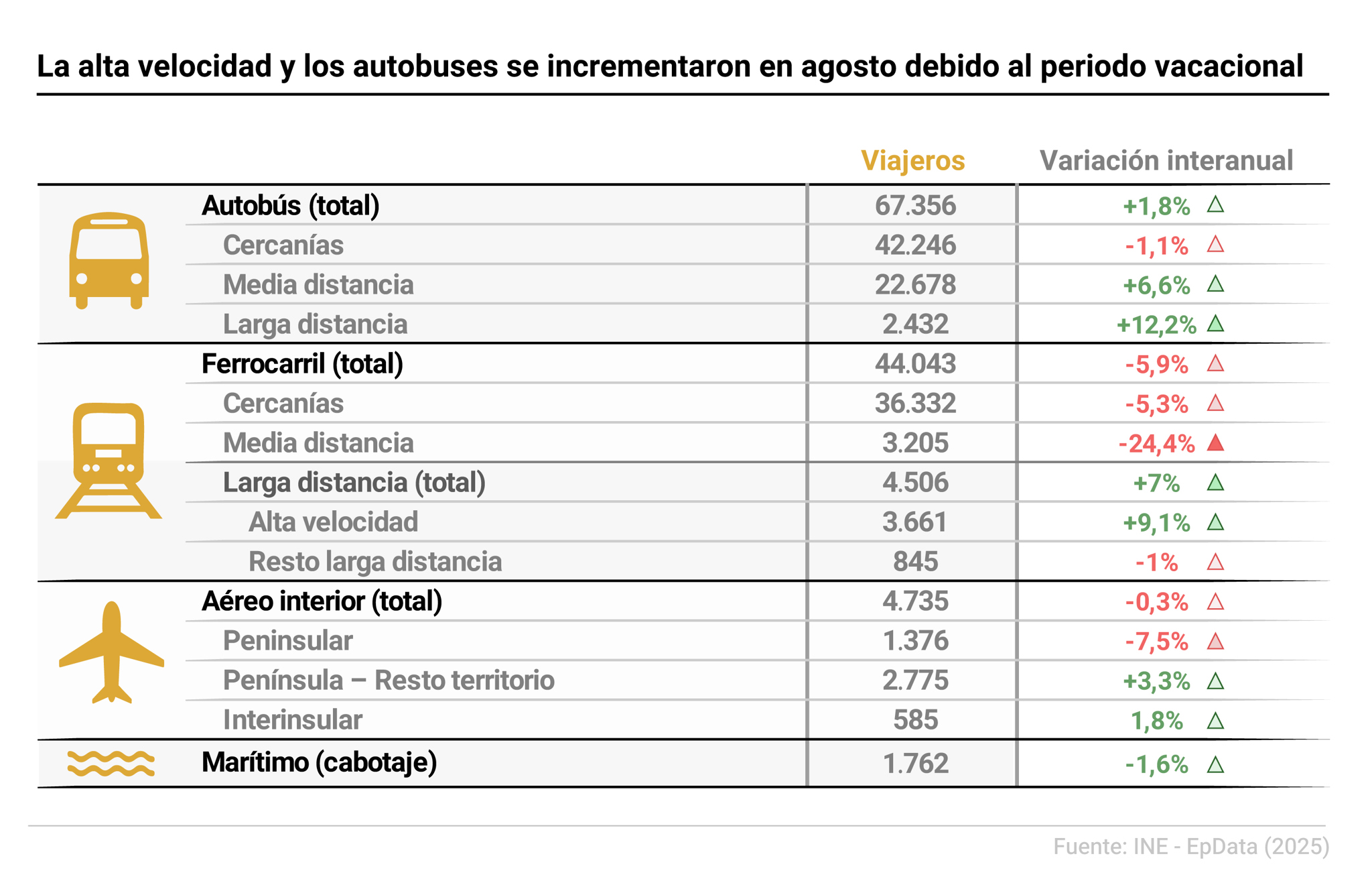 Dentro de esta, el ferrocarril de alta velocidad destacó especialmente al ser utilizado por más de 3,6 millones de viajeros y registrar un incremento del 9,1% respecto a agosto de 2024.