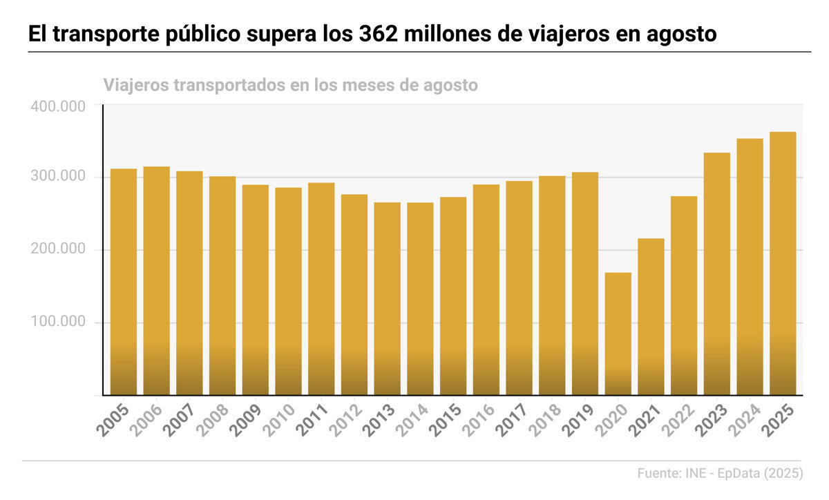 El transporte público fue utilizado por más de 362,4 millones de pasajeros en España el pasado mes de agosto, lo que supone un incremento del 2,6% respecto al mismo mes de 2024, según la Estadística de Transporte de Viajeros publicada este viernes por el Instituto Nacional de Estadística (INE), que destaca los incrementos de la alta velocidad y los autobuses asociados al periodo vacacional.