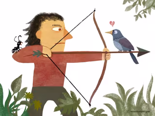 Llegó entonces un cazador, gran arquero, que al ver a la paloma se dispuso a dispararle una flecha. La hormiga se percató y rápidamente trepó hasta su mano. ¡No podía permitir que el cazador disparase a su salvadora! La hormiga le mordió con todas sus fuerzas y el cazador sorprendido y dolorido soltó la flecha, y con el ruido, la paloma despertó y huyó volando.