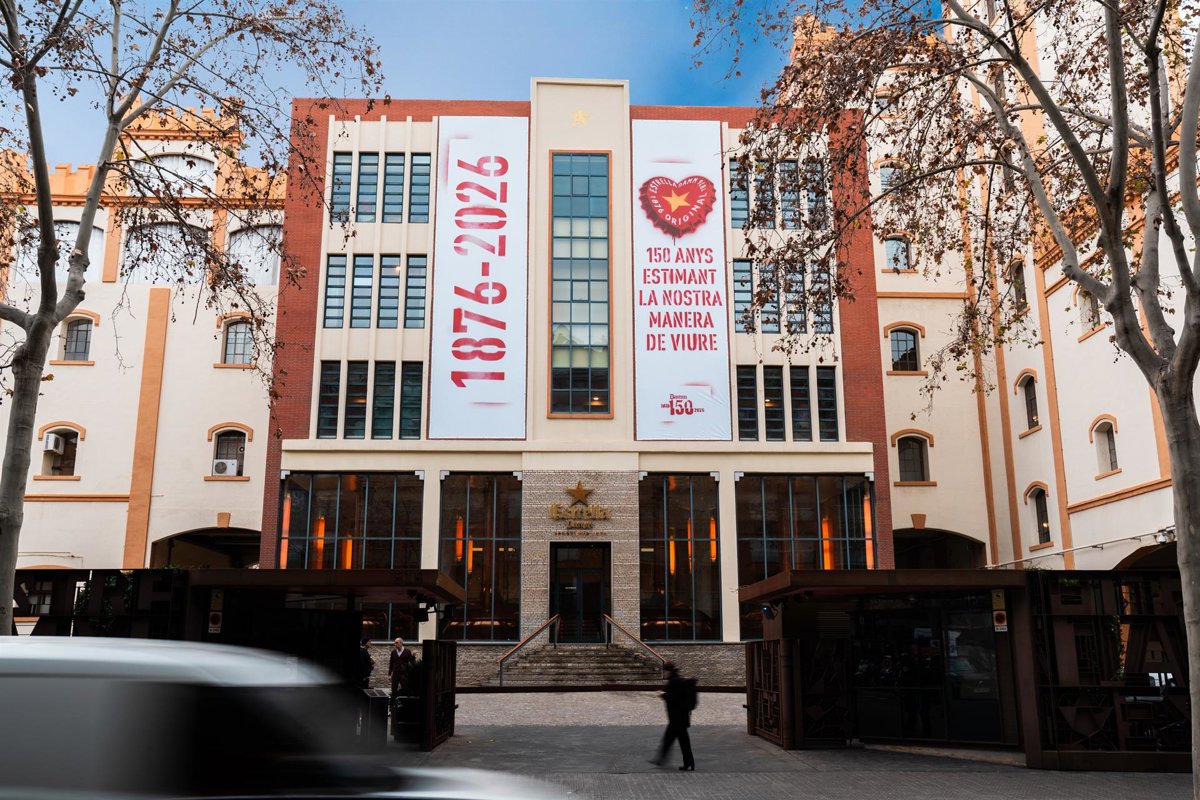 Fachada de la Antigua Fábrica Damm con la celebración del 150 aniversario de la cervecera. - DAMM