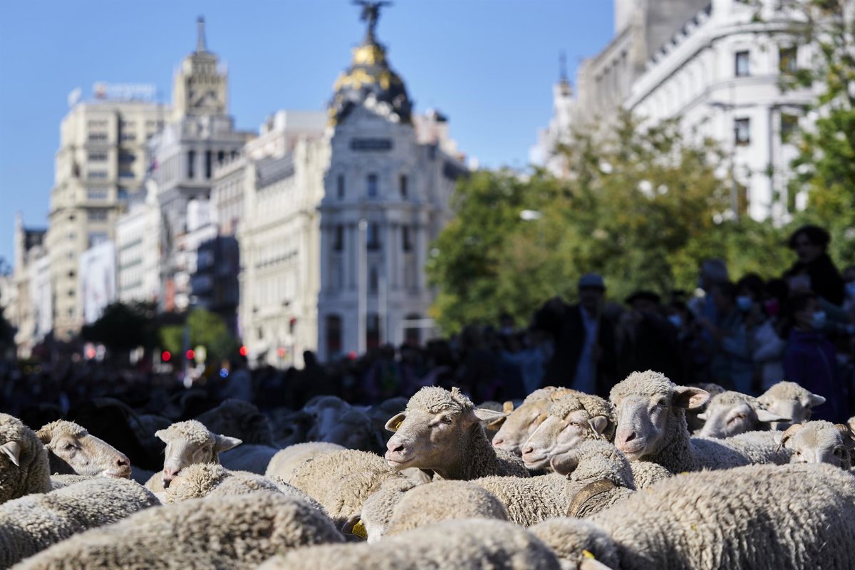 Archivo - Un rebaño trashumante de cabras y ovejas, frente al edificio Metrópolis, a 24 de octubre de 2021, en Madrid (España). Mil ovejas merinas y cien cabras retintas del rebaño trashumante transitan este domingo por el centro de Madrid en la XXVIII - A. Pérez Meca - Europa Press - Archivo