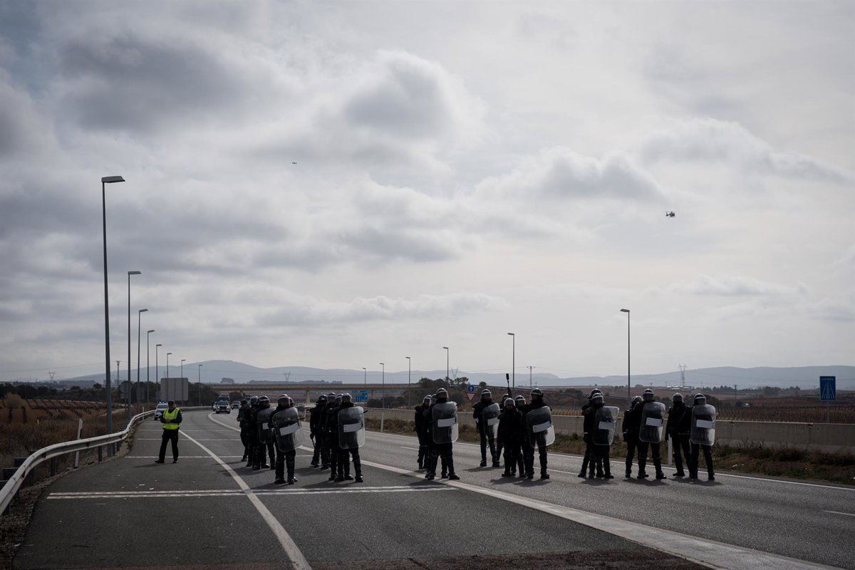 Varios antidisturbios acuden a una carretera cortada por decenas de agricultores durante la tercera jornada de protestas de los ganaderos y agricultores para pedir mejoras en el sector, en la autovía A-3, a 8 de febrero de 2024, en Valencia, Comunidad V - Adri Salido - Europa Press