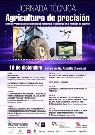 La Comunidad de Regantes Canal del Pisuerga celebrará este jueves, 19 de diciembre, en la localidad palentina de Astudillo, una jornada técnica dedicada a analizar la importancia de la agricultura de precisión como herramienta de sostenibilidad económica y ambiental en la rotación de cultivos, con especial atención aspectos como las tecnologías a aplicar, la teledetección, la función de la maquinaria, el abonado, la pulverización y las mejoras para la conservación de suelos.