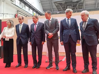 La directora de la BWW, Céline Pérez; el presidente de Fira Barcelona, Pau Relat; el ministro Planas, el conseller Ordeig, el presidente de BWW, Josep Pagès, y el director de Fira de Barcelona, Constantí Serrallonga - EUROPA PRESS