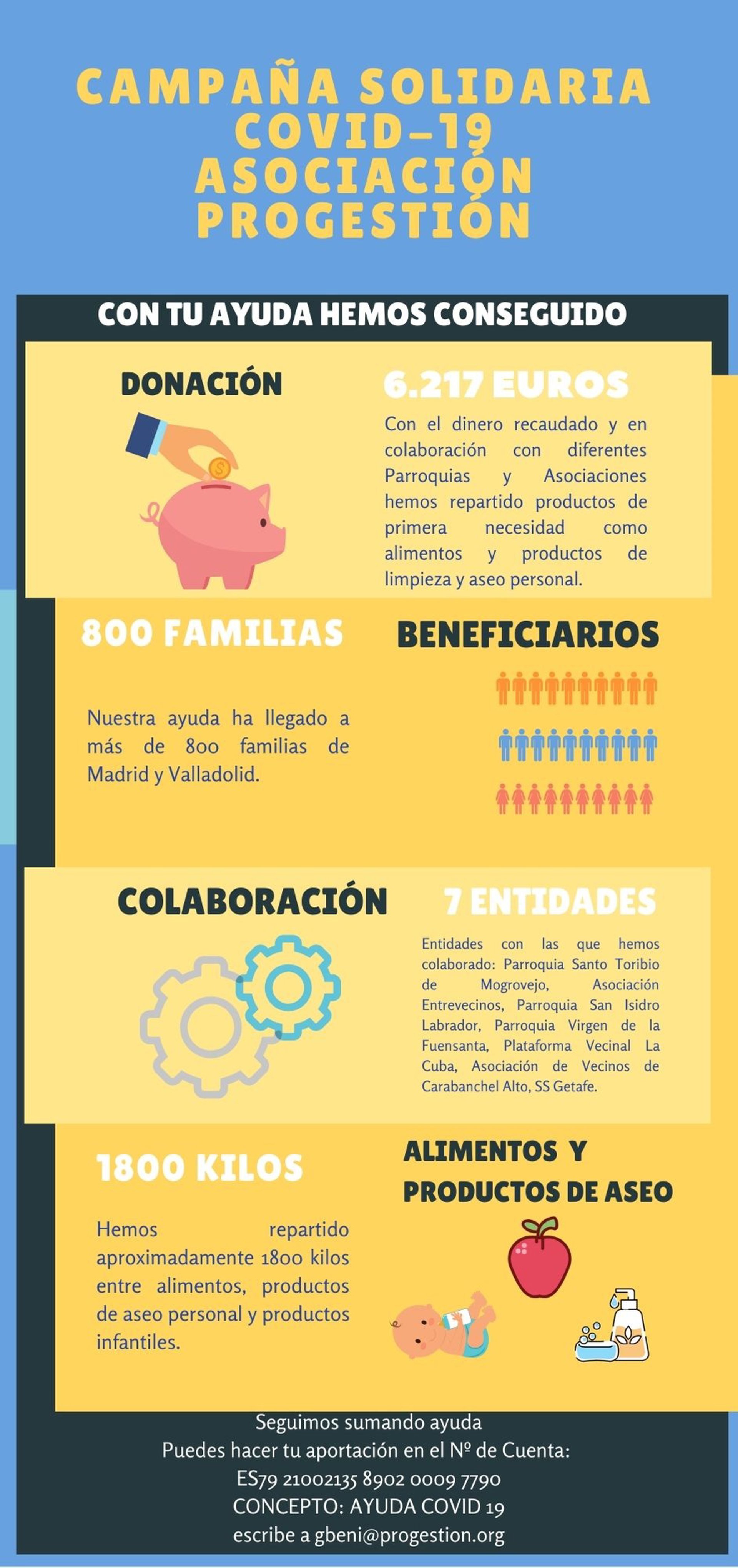 Cerca de 800 familias en Madrid y Valladolid especialmente afectadas por la crisis económica provocada por la emergencia sanitaria de la Covid-19 se han visto beneficiadas de forma directa por la campaña solidaria de Progestión, fruto de 6.217 euros en donaciones en metálico, 1.800 kilos de alimentos y productos para la higiene personal a través de la estrecha colaboración de siete organizaciones eclesiáticas y civiles.