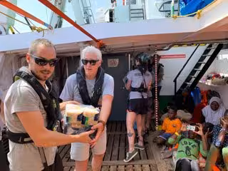 Gere (Filadelfia, 1949) ha subido al Open Arms acompañado del fundador de la entidad, Óscar Camps, y ha repartido comida a la tripulación y a los migrantes.